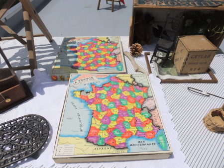 カラフルなのは、さすがフランス。蓋の側面に地方の旗や民族衣装を着たキャラクターたちが並んでいます。本体、箱はボール紙で歪みや箱の劣化など多少ございます。