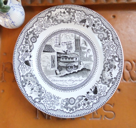 ブラック&ホワイトのシックなデザイン。物語が描かれていたり風刺画や、なぞなぞがデザインされていたりする フランスの古い絵皿ですが、こちらのプレートは良く見ると、面白い絵皿でした。