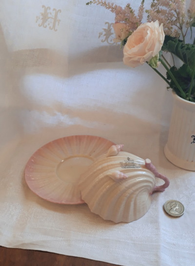 ウェールズ皇太子の食器としてデザインされたシェルデザイン、ネプチューンシリーズのカップ&ソーサー。Belleek社は、1857年、北アイルランドの町、ベリークにて創業し、職人が手作業で制作しています。