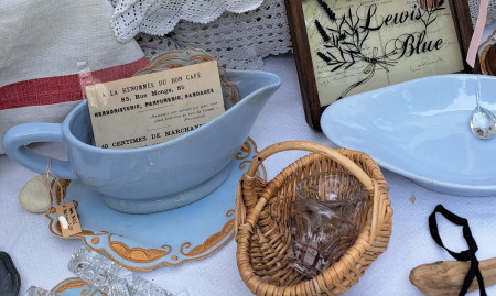 少しくすんだブルー色が大人可愛いカラーで、お花など飾って楽しみたいお品です。