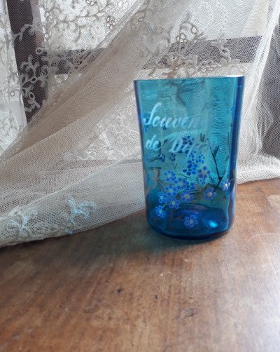 フランス 1900年代 美しいブルーのエナメルグラス。エナメル彩が丁寧に描かれています。