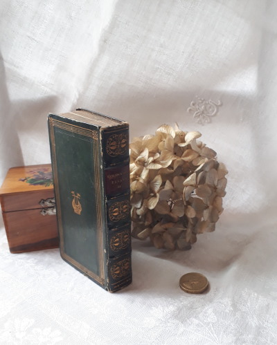 アンティーク本らしい本革の美しい背表紙、金彩、ハープのようなデザインも施され、多少染みや最初のページに書き込みや、小さな傷はありますが、状態も古書にしては、良いコンディションです。