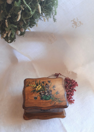 フランス コートダジュール地方のビーチリゾート地 Saint Raphael サンラフェルの地名とミモザとスミレが描かれた、オリーブ材のモシュリンヌ